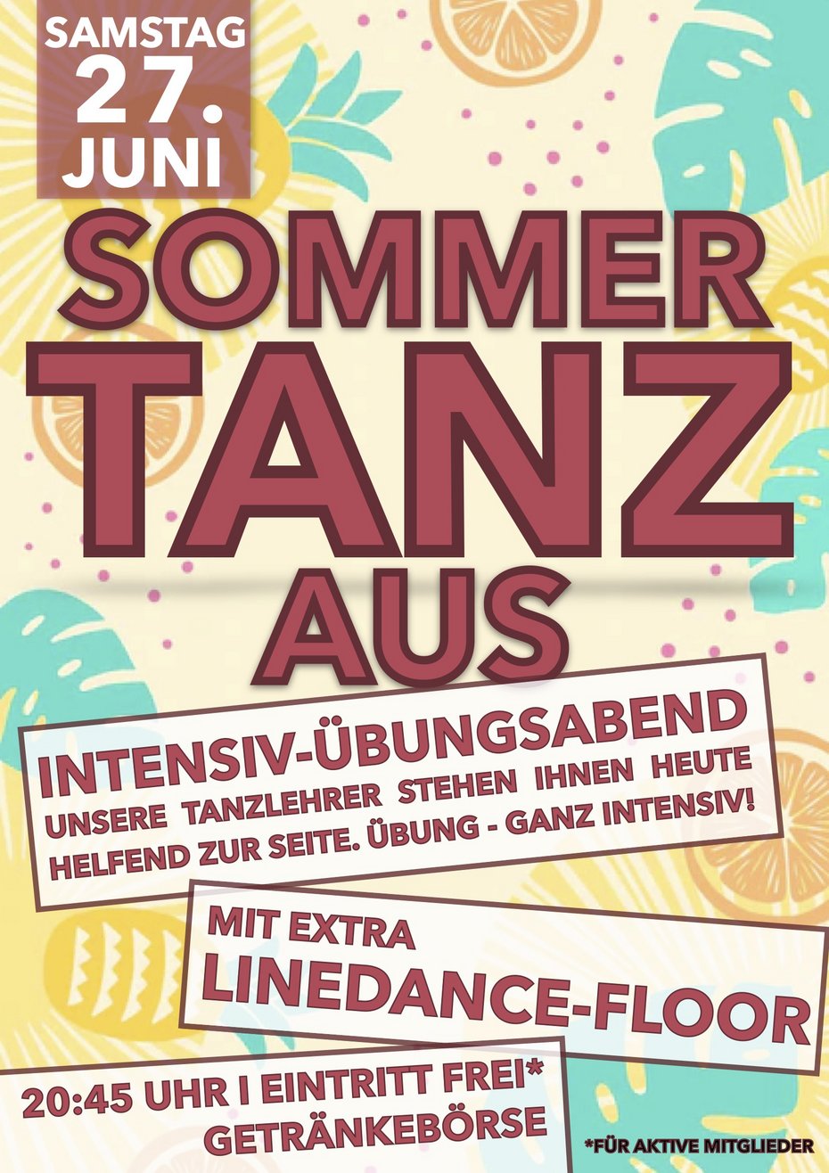 Wir laden zum letzten Tanz vor den Sommerfrien, und bieten Ihnen einen weiteren "INTENSIV-ÜBUNGSABEND" an. Intensiv, da heute unsere Tanzlehrer auf der Fläche sind und Ihnen bei allem bereits erlernten helfen.